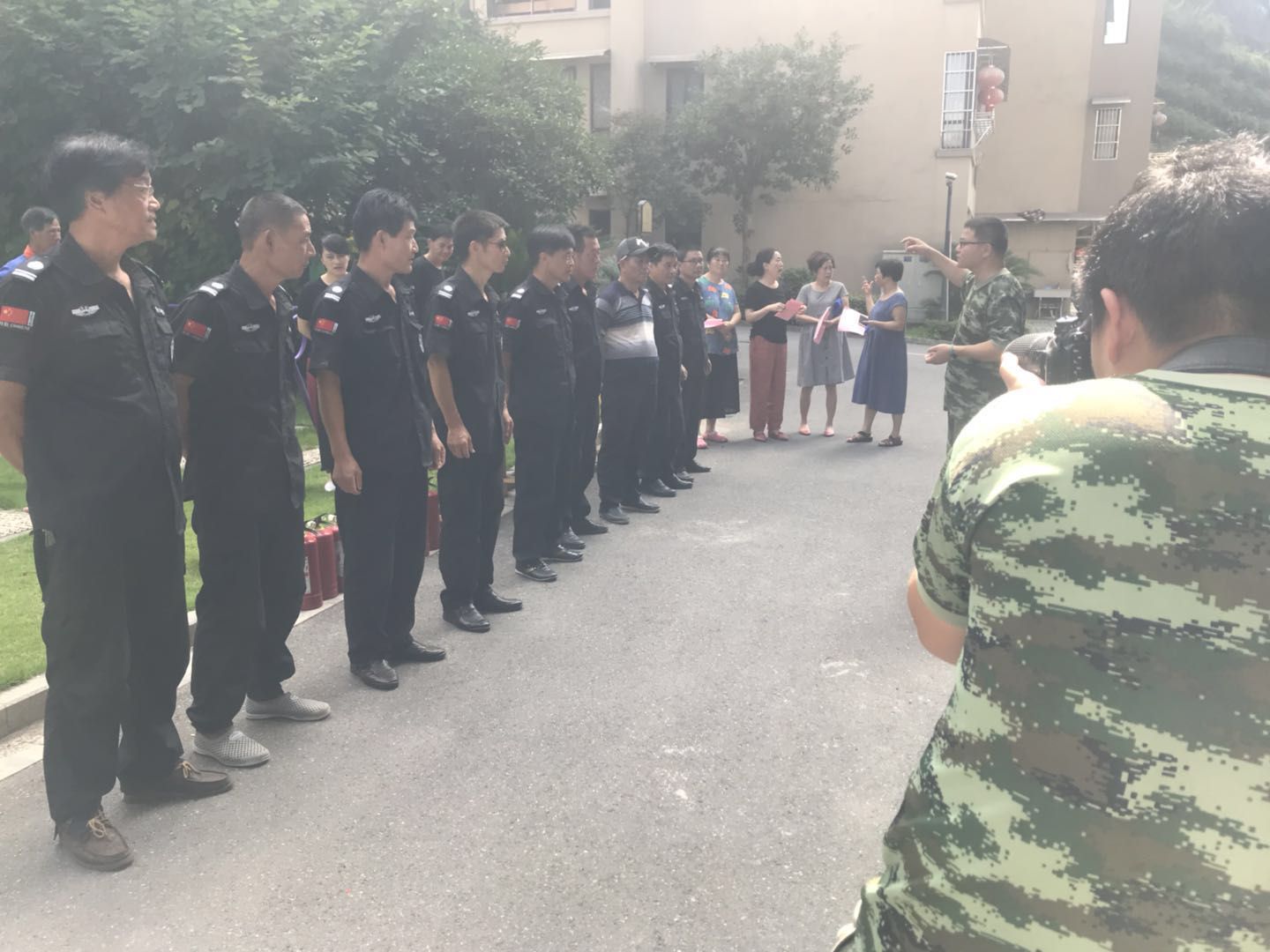 小區(qū)住戶(hù)在消防戰(zhàn)士的指導(dǎo)下使用滅火器